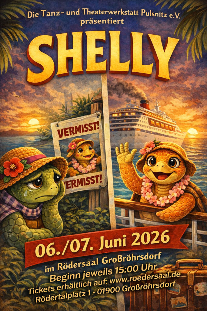 Shelly und Kelly – Ein Musical voller Tanz und Gefühl In diesem farbenfrohen Musical erleben die beiden Schildkrötenschwestern Shelly und Kelly einen unvergesslichen Tag am Strand – bis sie sich plötzlich verlieren. Allein begeben sie sich auf eine spannende Reise: Shelly landet auf einem großen Kreuzfahrtschiff, während Kelly mutig nach ihr sucht. Mit mitreißender Musik, ausdrucksstarkem Tanz und 160 Tänzerinnen und Tänzern wird ihre Geschichte von Freundschaft, Mut und Zusammenhalt erzählt. Am Ende zeigt sich: Wahre Geschwisterliebe findet immer wieder zusammen. Gespielt, gesungen und getanzt von Kindern und Jugendlichen der Tanz- und Theaterwerkstatt Pulsnitz e.V.